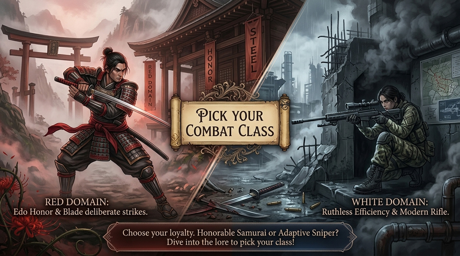 On one side stands the Red Domain, rooted in a traditional 1861 Edo-era mindset. Elite samurai like Theo believe combat must be close-range, deliberate, and fiercely honorable. They wield katanas and view long-range guns as the cowardly weapons